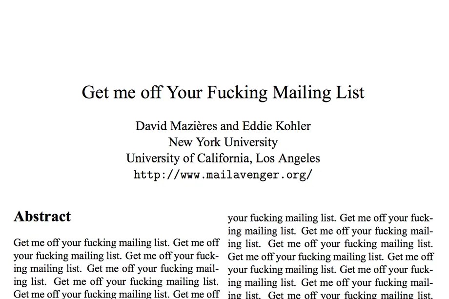 David Mazières and Eddie Kohler ส่งบทความที่ไม่มีข้อความอะไรมากไปกว่า “Get Me Off Your Fucking Mailing List” ซ้ำไปซ้ำมา แต่เขากลับแปลกใจ (จนเกือบตกเก้าอี้) ที่ทางวารสารตอบรับบทความนี้ แถมด้วยการให้ผลการประเมินในระดับ Excellent ! จาก reviewer ของวารสาร (ที่น่าจะไม่มีตัวตนอยู่จริง) แลกกับค่าธรรมเนียม 150 เหรียญสหรัฐ !!! ในการตีพิมพ์บทความ